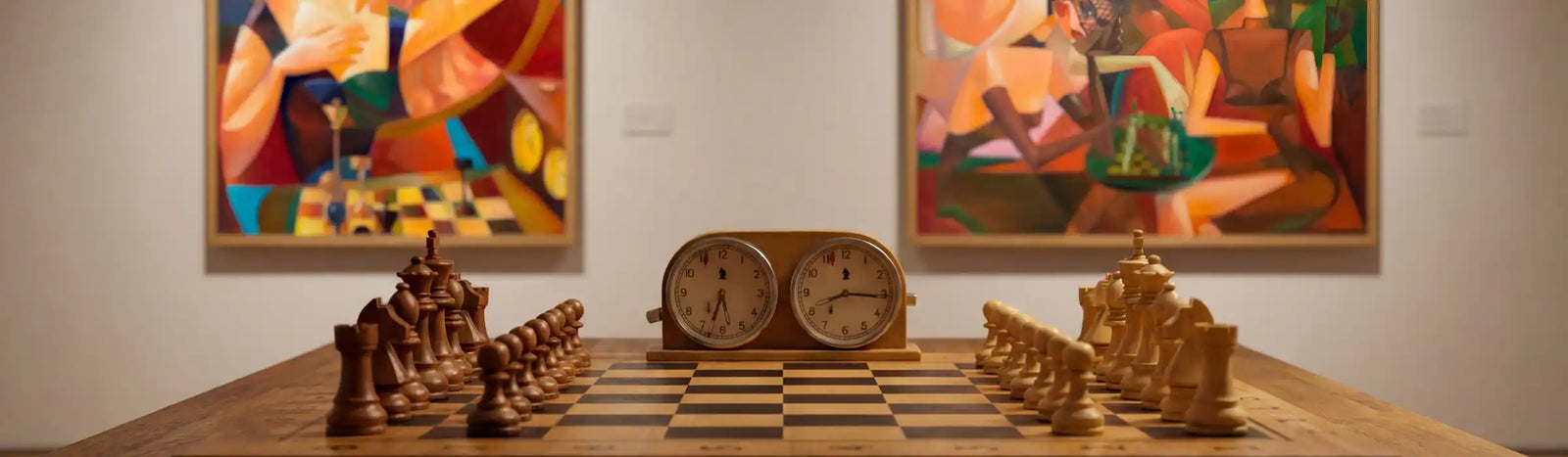 Alongside our wall-mounted chessboards, this space brings together chess-related artworks and gallery pieces — paintings, photographic works, and objects that extend the presence of chess beyond the board.