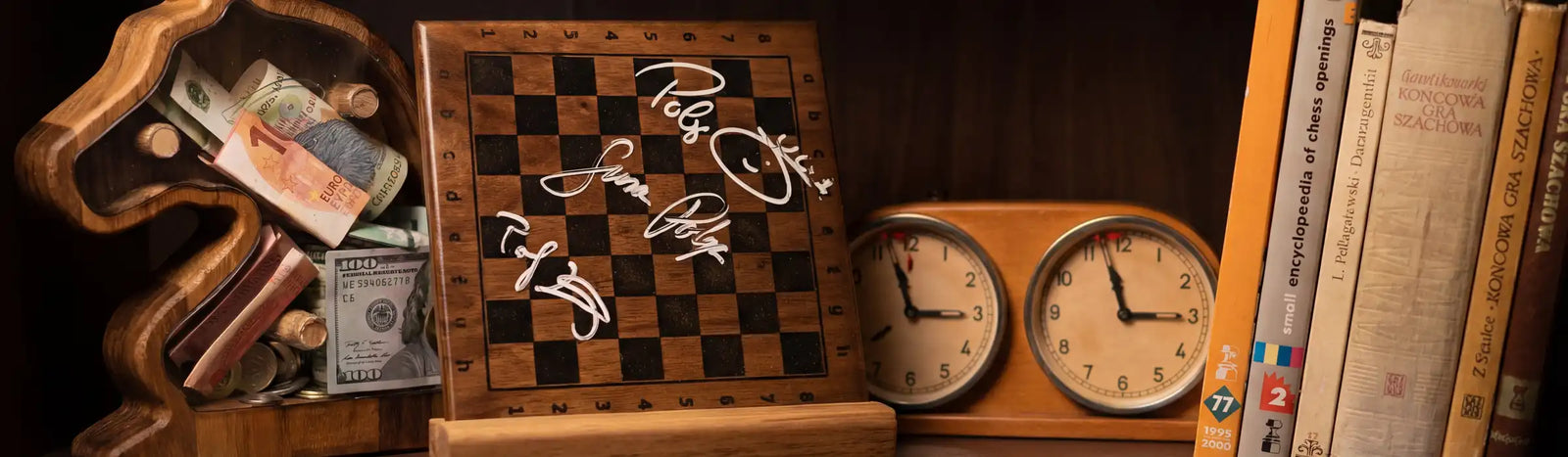 This section gathers the smaller (and sometimes surprisingly large) objects that help chess live in an interior: wooden décor, practical accessories, display elements, and gift pieces made to last.
