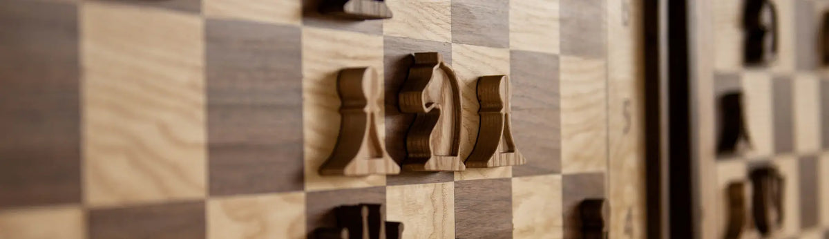 Here you will find chess art designed to hang — our vertical and demonstration chessboards, as well as selected chess-related artworks. Objects that combine play, form, and presence within an interior.